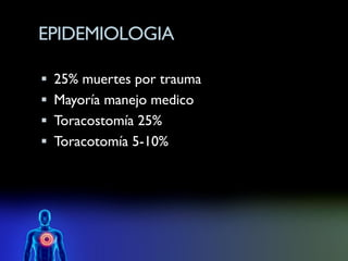 Este documento resume las principales lesiones y el manejo del trauma torácico. Describe las lesiones que comprometen la vida como el neumotórax a tensión, el taponamiento cardíaco y el hemotórax masivo, y cómo deben ser tratados de manera urgente. Explica los procedimientos de toracostomía y toracotomía, indicando cuándo cada uno debe ser realizado. Resalta la alta incidencia de lesiones asociadas con el trauma torácico y que a pesar de ello, la mayoría de los pacientes pueden