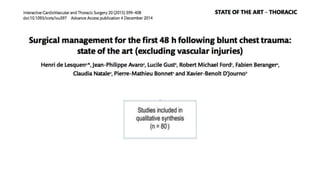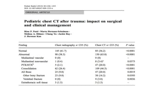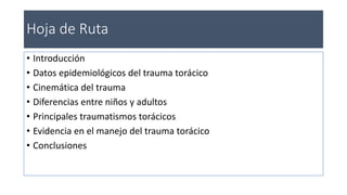 Este documento resume los principales aspectos del trauma torácico en pediatría. Explica que es la segunda causa de mortalidad después del traumatismo craneal y que su mortalidad varía entre un 5-10% para el trauma torácico aislado y hasta un 40% cuando coexisten lesiones torácicas, abdominales y craneales. Describe las principales lesiones torácicas como neumotórax, hemoneumotórax, contusión pulmonar, fracturas costales y lesiones vasculares o del corazón, así como su manejo.