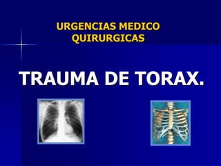 Este documento resume las lesiones torácicas más graves que ponen en peligro la vida en urgencias, incluyendo el neumotórax a tensión, el hemotórax masivo y el taponamiento cardiaco. Describe la fisiopatología, signos y síntomas, y tratamiento de cada una. También cubre otros temas como el trauma de tórax, el torax inestable, y proporciona estadísticas epidemiológicas sobre la incidencia de estas lesiones.