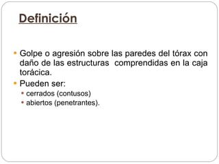 El documento resume las definiciones, epidemiología, clasificación, lesiones, fisiopatología y manejo de los traumatismos torácicos. Describe las lesiones torácicas más graves como obstrucción de vía aérea, neumotórax a tensión, hemotórax masivo y tórax inestable. Explica en detalle las fracturas costales, neumotórax, hemotórax, contusión pulmonar y lesiones cardiovasculares como parte del trauma torácico.