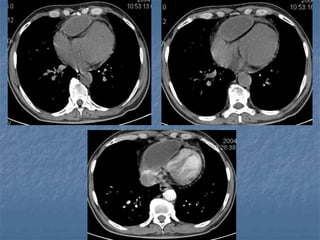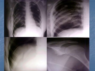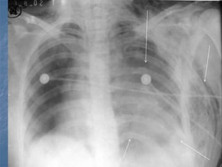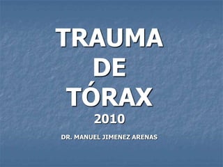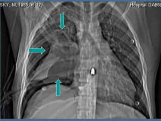 1. El documento describe diferentes tipos de lesiones por trauma de tórax, incluyendo aquellas que ponen en peligro la vida de forma inmediata como obstrucción de la vía aérea, neumotórax a tensión y hemotórax masivo, y aquellas que pueden matar de forma mediata como neumotórax simple y contusión pulmonar.