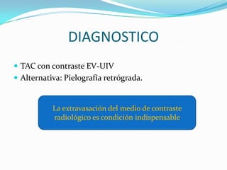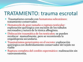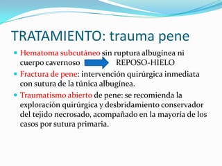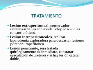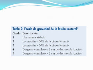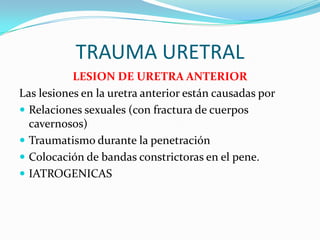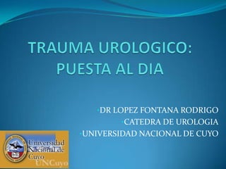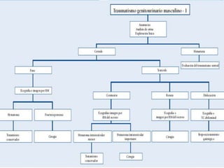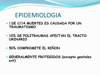 El documento resume los principales aspectos del trauma urológico. 1) Los riñones son el órgano genitourinario más comúnmente afectado por traumatismos, representando entre el 1-5% de los casos. 2) La clasificación de las lesiones renales se realiza en 5 grados en función de la gravedad. 3) El diagnóstico incluye anamnesis, exploración física y pruebas de imagen como TC o ecografía. El tratamiento depende de la gravedad de la lesión y puede ser quirúrg