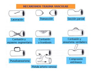 El documento resume el tema del trauma vascular. Define el trauma vascular como una lesión traumática de los vasos sanguíneos. Explica que las lesiones vasculares ocurren con más frecuencia en hombres entre 20-40 años, y que las arterias más comúnmente afectadas son la femoral superficial y la aorta abdominal. Describe los signos y síntomas de las lesiones vasculares, así como los métodos de diagnóstico y tratamiento para diferentes regiones del cuerpo.