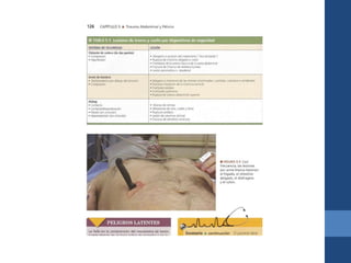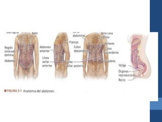 El documento describe la anatomía del abdomen y los mecanismos de lesión más comunes. La anatomía del abdomen incluye el abdomen anterior, la región toracoabdominal, los flancos, la espalda y la cavidad pélvica. Los mecanismos de lesión más frecuentes son el trauma cerrado como los impactos directos, y el trauma penetrante causado por armas blancas o de fuego, resultando en laceraciones de órganos como el hígado, intestino delgado y colon.