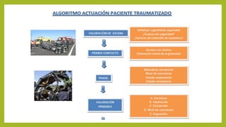 Este documento proporciona información sobre el trauma y el politraumatismo. Explica que el trauma es la primera causa de muerte en la población joven y la tercera en la población general. Describe las fases del trauma, incluida la importancia de la atención en la primera hora. Detalla la evaluación y el manejo inicial de un paciente politraumatizado, enfocándose en las vías aéreas, respiración, circulación, estado neurológico y control ambiental. Finalmente, explica la valoración secundaria a través de