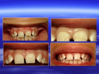 Este documento trata sobre los traumatismos dentofaciales en dientes permanentes durante la dentición mixta. Describe la epidemiología, etiología y clasificación de los traumatismos dentales según la OMS. Presenta el caso clínico de un paciente de 8 años con fractura coronaria en dos dientes superiores, cuyo tratamiento consistió en una reconstrucción indirecta con resina compuesta mediante incrementos y horneado. El objetivo del tratamiento es preservar los dientes afectados y restablecer la fisiología, anatomía