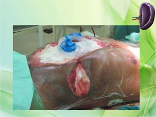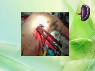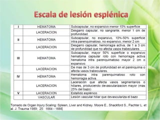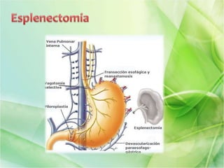 El documento describe la anatomía, función y patologías quirúrgicas del bazo. Explica que el bazo es un órgano vascular que almacena sangre y ayuda en la filtración y destrucción de bacterias. Las lesiones más comunes son traumáticas, clasificadas en 5 grados de gravedad. El tratamiento depende del grado de lesión, pudiendo ser observación, esplenorrafia o esplenectomía abierta o laparoscópica. Las complicaciones posquirúrgicas incluyen infe