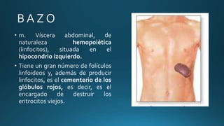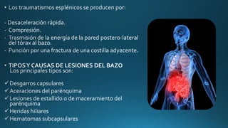 Este documento describe las características generales del bazo y clasifica los tipos de lesiones que puede sufrir en base a su gravedad. Describe las lesiones hematomas y laceraciones del bazo de menor a mayor gravedad en tres categorías. También enumera algunas de las posibles complicaciones quirúrgicas y médicas tras una esplenectomía, incluyendo neumonías, derrame pleural, abscesos, hemorragia tardía, pancreatitis, trombocitosis y un aumento del riesgo de infecciones graves.