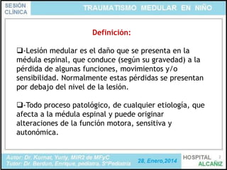 1) El documento describe la lesión medular en niños, incluyendo su definición, anatomía, causas, epidemiología y tratamiento.