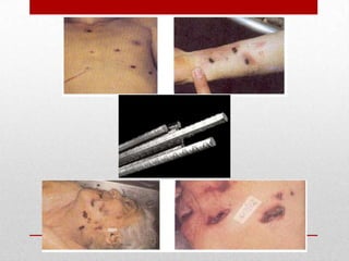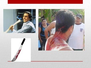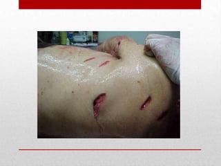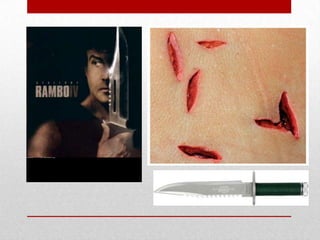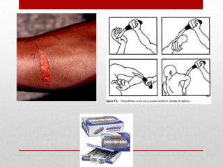Este documento describe diferentes tipos de lesiones y agentes vulnerantes en traumatología forense. Define lesiones como cualquier daño que deje huella material en el cuerpo producido por una causa externa. Describe lesiones por agentes mecánicos, químicos, biológicos y físicos, incluyendo excoriaciones, equimosis, hematomas, fracturas, quemaduras y heridas causadas por armas de fuego, arma blanca o agentes contundentes. Explica las características de diferentes lesiones que pueden ayudar a determin