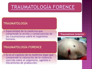 Este documento presenta información sobre traumatología forense y lesiones. Describe diferentes tipos de traumatismos y lesiones de acuerdo a su mecanismo de producción, gravedad e intencionalidad. También cubre descripciones detalladas de lesiones específicas como las de tórax, abdomen, cuello y extremidades. Finalmente, discute la importancia de realizar pericias médico legales completas en casos de lesiones.