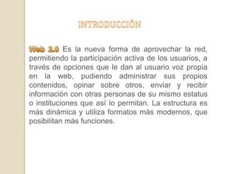 Este documento describe la Web 2.0, la nueva forma de usar la web que permite una mayor participación de los usuarios al compartir y administrar contenidos. Se mencionan herramientas como blogs, wikis y plataformas para compartir videos, fotos y presentaciones. También se discuten tecnologías como Ajax que apoyan la Web 2.0 al hacer las aplicaciones web más dinámicas e interactivas. Finalmente, se señala que la Web 2.0 es más fácil de usar para los usuarios al proveer servicios en línea sin necesidad de descargas.
