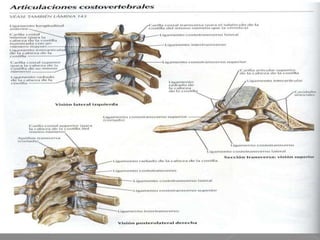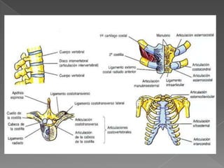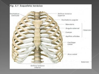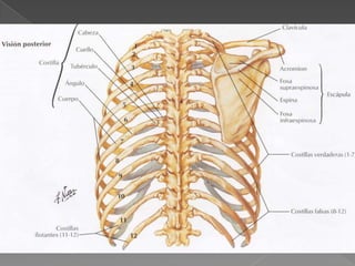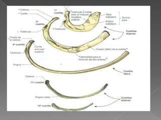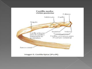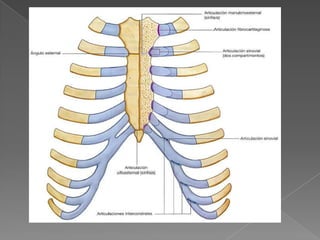 El documento describe la anatomía del esternón y las costillas. El esternón es un hueso plano situado en el centro del tórax que consta de tres partes: el manubrio, el cuerpo y la apófisis xifoides. Se articula con las 7 primeras costillas a través de sus cartílagos costales. Las costillas se articulan con la columna vertebral y con el esternón a través de los cartílagos costales.