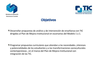 El documento presenta una capacitación sobre estrategias y líneas de acción con TIC en el Plan de Mejora Institucional. La capacitación aborda la enseñanza y el aprendizaje con integración de TIC en experiencias institucionales en el marco del modelo 1 a 1. Se proponen proyectos didácticos y herramientas de gestión con TIC para el Plan de Mejora Institucional. El curso es semipresencial de 60 horas con trabajos prácticos y un examen final integrador sobre un proyecto interdiscipl