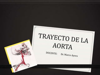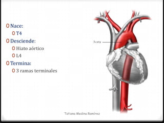 El documento describe la anatomía de las principales arterias del cuerpo humano. Brevemente describe el origen, recorrido y ramificaciones de la aorta torácica y abdominal, incluyendo las arterias coronarias, carótidas, subclavias, arterias intestinales y renales.