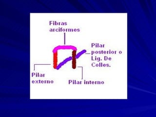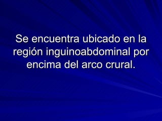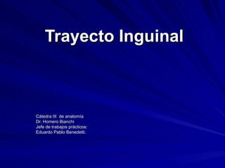 El documento resume las características del trayecto inguinal, incluyendo sus dos paredes, dos bordes y dos anillos. Presenta la pared anterior compuesta por la aponeurosis del músculo oblicuo mayor, y la pared posterior compuesta por la fascia transversalis. Describe el contenido del trayecto inguinal en hombres, que incluye el cordón espermático, y en mujeres, que incluye el ligamento redondo del útero.
