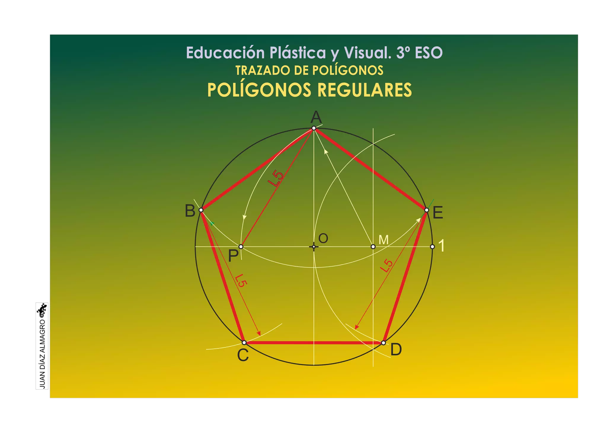 El documento detalla la clasificación y características de polígonos regulares y los métodos para su construcción, como triángulos, cuadrados y pentágonos, basándose en el radio de la circunferencia circunscrita. Se explica la definición de polígonos, sus elementos (lados, vértices, ángulos) y tipos específicos según la cantidad de lados. Además, se presentan los pasos para construir polígonos regulares utilizando compás y regla.