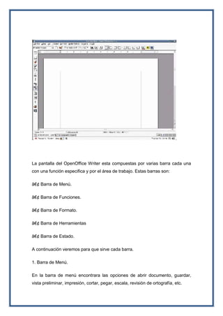OpenOffice Writer es un procesador de texto libre que permite crear documentos similares a Microsoft Word. Cuenta con barras de menús, herramientas y formato que facilitan la inserción de texto, imágenes y tablas. Los documentos creados en Writer se guardan como archivos con extensión .sxw.