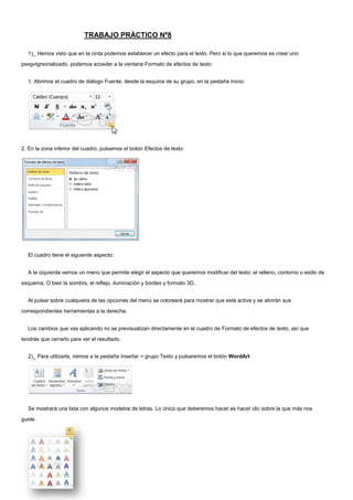 El documento proporciona instrucciones sobre cómo aplicar formatos de texto como efectos, estilos, sangría, alineación, tabulaciones y bordes en Microsoft Word. Explica cómo acceder a las herramientas de formato en las pestañas Inicio, Diseño de página e Insertar, y cómo seleccionar y modificar las opciones de formato para aplicarlos al texto.