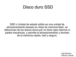 Un SSD o unidad de estado sólido es un disco duro basado en chips de memoria flash en lugar de partes mecánicas, lo que permite un almacenamiento y borrado más rápido y seguro de la memoria. Los SSD tienen ventajas como mayor velocidad, resistencia a golpes, bajo consumo de energía y calor, pero también desventajas como un precio más alto y pérdida de datos si el chip falla.