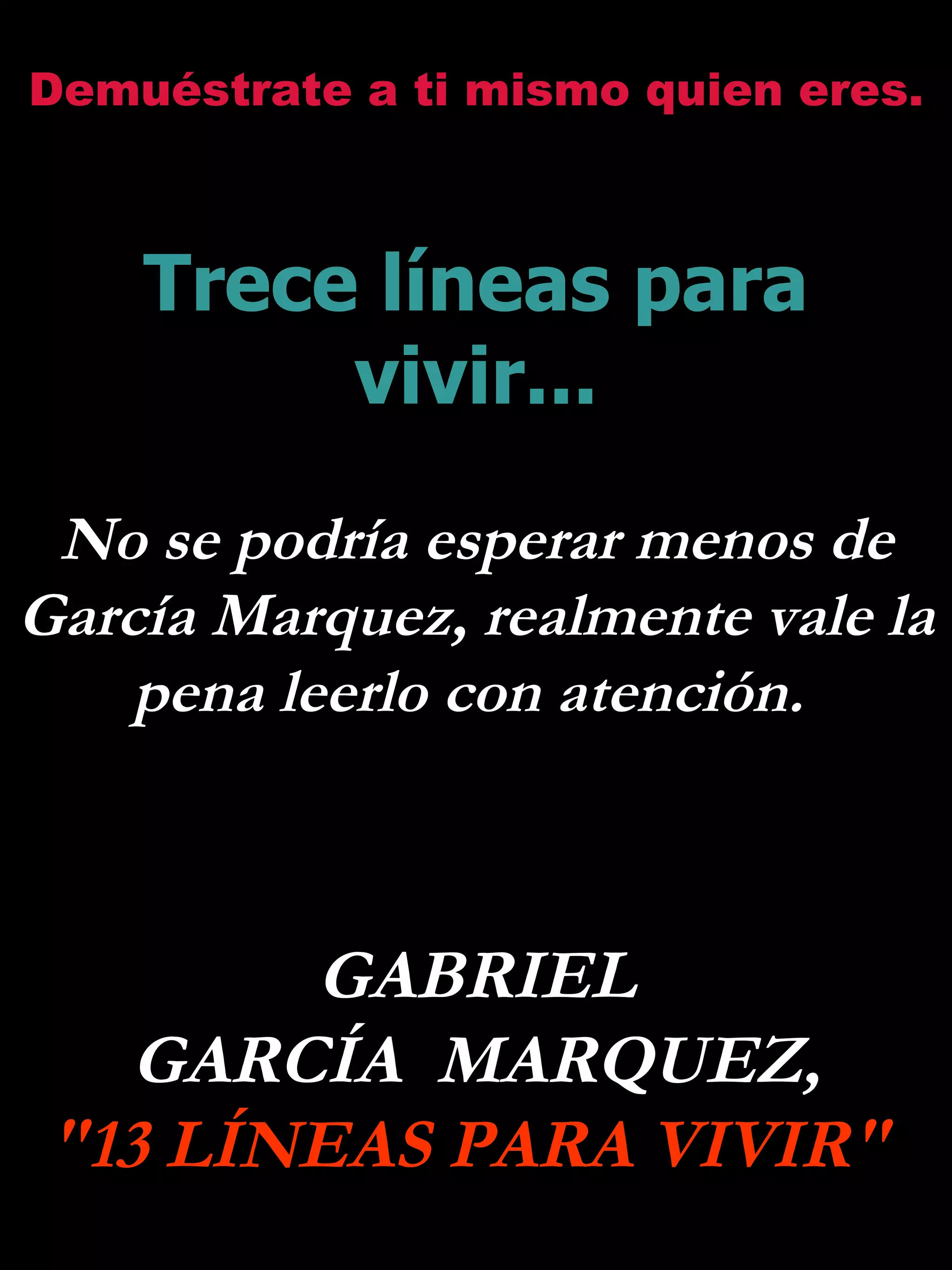 El documento presenta 13 líneas de consejos sobre las relaciones interpersonales escritas por Gabriel García Márquez. Alienta a las personas a amarse a sí mismas, a no llorar por quienes no los aman y a valorar a quienes los aman de verdad. También insta a sonreír a pesar de la tristeza y a no desperdiciar el tiempo con quienes no lo valoran.