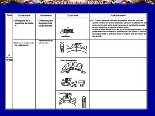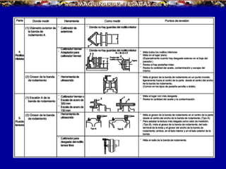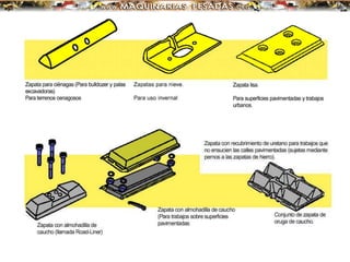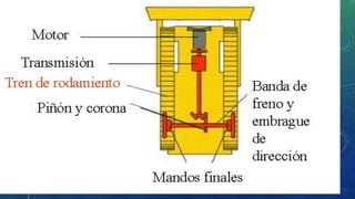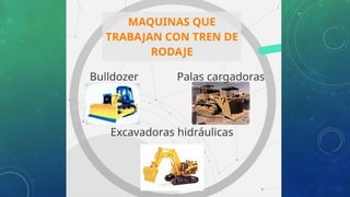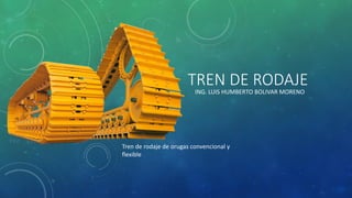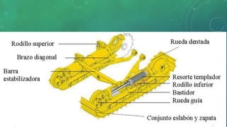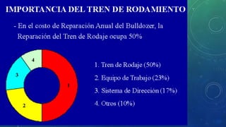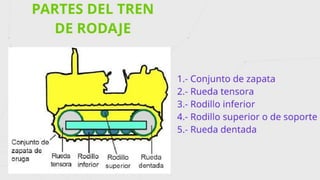 El documento describe el funcionamiento y componentes del tren de rodaje de orugas, destacando su capacidad para operar en terrenos difíciles y la importancia de su mantenimiento. Explica las partes clave como orugas, ruedas dentadas y bujes, así como las funciones críticas de cada componente. También se abordan los problemas de desgaste y la necesidad de inspecciones periódicas para evitar costosas reparaciones.