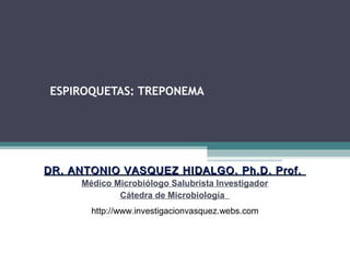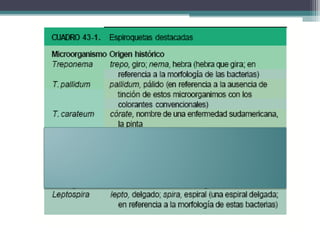 Las espiroquetas son bacterias helicoidales gramnegativas que incluyen los géneros Treponema, Borrelia y Leptospira. Treponema pallidum causa la sífilis y se transmite principalmente a través del contacto sexual. Presenta proteínas de membrana que le permiten adherirse e invadir tejidos. La respuesta inmune incluye anticuerpos específicos y no específicos. La sífilis puede presentarse en etapas primarias, secundarias o tardías con diferentes manifestaciones clínicas.
