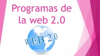 El documento habla sobre tres programas de la Web 2.0: Prezi, Blendspace y Glogster. Prezi es una aplicación para crear presentaciones dinámicas de manera original e insertar archivos multimedia. Blendspace permite organizar materiales educativos en línea como videos, imágenes y enlaces. Glogster es una red social donde los usuarios pueden crear carteles interactivos llamados "glogs" e incorporar texto, imágenes, sonido y video.