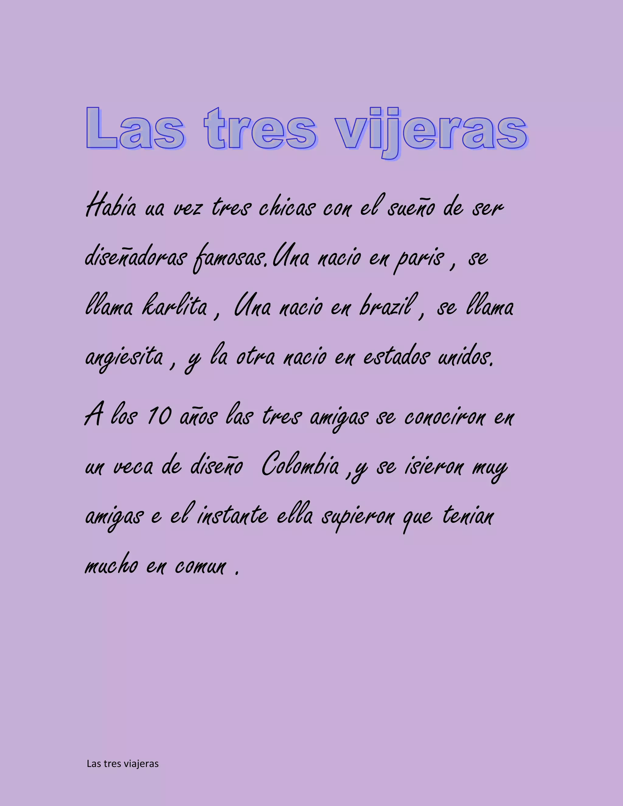 Tres niñas de diferentes países se conocieron en una feria de diseño en Colombia a los 10 años y se hicieron amigas. A pesar de sus diferencias, siempre se apoyaron mutuamente y un día juntaron sus ideas para crear vestidos únicos que no se habían visto antes, dedicándose al diseño el resto de sus vidas.
