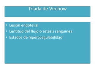 El documento describe varias tríadas médicas, que son conjuntos de tres síntomas o hallazgos clínicos asociados con una determinada enfermedad o condición. Algunas de las tríadas mencionadas son la de Virchow asociada a trombosis, la de diabetes, la de Charcot relacionada con esclerosis múltiple y colangitis, la de hipertensión intracraneana, la de Beck y la de Whipple vinculadas a hipoglucemia, la de Anderson, la de Hutchinson sobre sífilis congénita, la de Horner