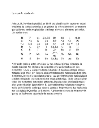 El documento describe los primeros intentos de clasificar los elementos químicos de acuerdo a sus propiedades. J.W. Döbereiner observó en 1817 que ciertos grupos de tres elementos (triadas) como cloro, bromo y yodo mostraban una variación gradual de propiedades. En 1827 identificó más triadas con esta característica. John A.R. Newlands propuso en 1864 una clasificación por orden creciente de masa atómica en grupos de siete elementos (octavas), similar a una escala musical, pero su propuesta fue rech