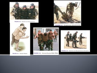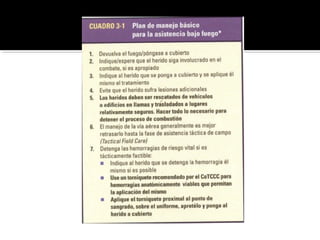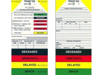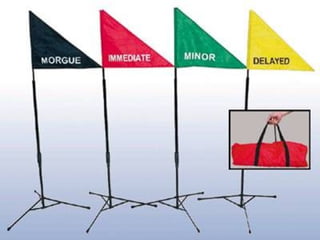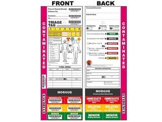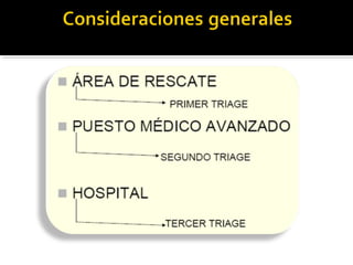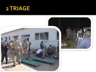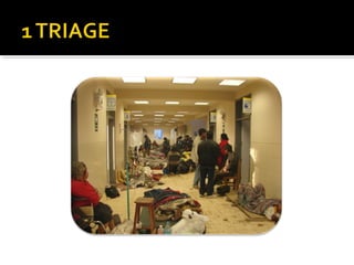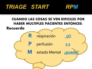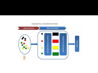 El documento describe el proceso de triage simple y rápido (START, por sus siglas en inglés) mediante el cual los pacientes son evaluados y clasificados en menos de 3 segundos según su capacidad para caminar, respirar, pulso y estado mental, y se les asigna una etiqueta de color -verde, rojo o negro- para determinar el orden de tratamiento. El triage aeronáutico tiene como objetivo seleccionar, categorizar y priorizar a las víctimas de acuerdo a su posibilidad de transporte y supervivencia para una aeroev