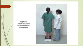 Este documento describe los procedimientos de triaje de admisión, incluyendo la medición de signos vitales como temperatura, pulso, respiración y presión arterial. Explica cómo medir cada signo vital, sus valores normales y posibles alteraciones. Además, detalla los procedimientos de somatometría para medir el peso, la talla y el índice de masa corporal de un paciente.