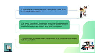 Este documento describe el proceso de triaje pediátrico en emergencias. Explica que el triaje permite clasificar a los pacientes según su nivel de urgencia para priorizar su atención de manera segura y eficiente. Describe los objetivos del triaje como asegurar que los pacientes más urgentes sean atendidos primero y determinar la mejor área para tratar a cada paciente. Finalmente, detalla los pasos para evaluar a los pacientes pediátricos, incluyendo examinar su apariencia, trabajo respiratorio y circulación cutánea.