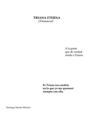 Este documento presenta un poema titulado "Triana Eterna" del autor Santiago Martín Moreno. El prólogo y la introducción describen a Triana como un barrio humilde y sencillo con una esencia única definida por su gente, arte, embrujo y gracia. El prólogo también introduce al autor como un bohemio apasionado de Triana que expresa la historia y alma del barrio a través de su poesía.