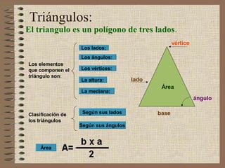El documento describe los elementos básicos de un triángulo, incluyendo sus tres lados, tres ángulos y tres vértices. Explica que un triángulo puede clasificarse como equilátero, isósceles o escaleno dependiendo de la longitud de sus lados. También define conceptos como la altura, mediana y área de un triángulo.
