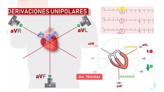 El triángulo de Einthoven es una formación imaginaria de los hombros y un tobillo que determina un triángulo virtual utilizado en electrocardiogramas. Registra las diferencias de potencial entre dos extremidades para derivaciones bipolares como entre brazo derecho-izquierdo, derecho-pierna izquierda, e izquierdo-pierna izquierda. También incluye derivaciones unipolares que anulan terminaciones negativas dejando solo positivas, y derivaciones precordiales para el electrocardiograma.