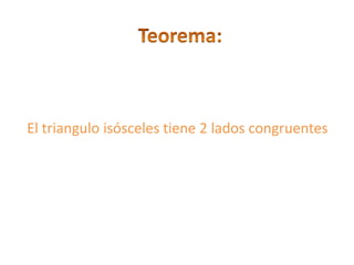 Este documento presenta la prueba de que en un triángulo isósceles, los lados que son congruentes implican que los ángulos opuestos a esos lados también son congruentes. Se demuestra primero que si un triángulo tiene dos lados congruentes, entonces esos lados forman triángulos congruentes con el punto medio del tercer lado, lo que implica que los ángulos opuestos a los lados congruentes también son congruentes.