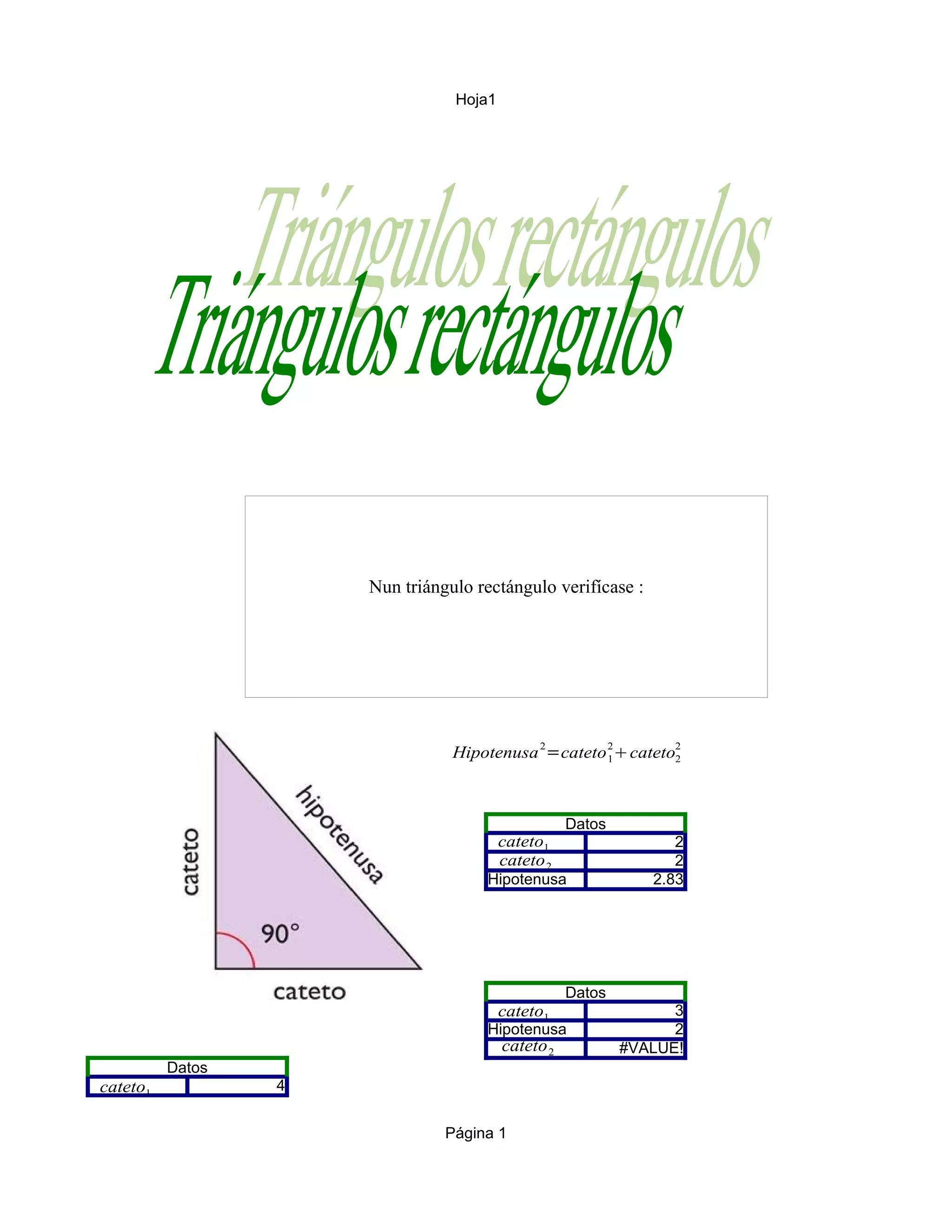 El documento presenta la fórmula para calcular la hipotenusa de un triángulo rectángulo a partir de los catetos. Proporciona ejemplos numéricos para ilustrar la aplicación de la fórmula y detecta errores en los valores introducidos que impiden su cálculo.