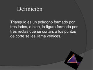 Este documento define un triángulo como una figura formada por tres rectas que se cortan, con los puntos de corte llamados vértices. Explica que los triángulos se clasifican según sus lados iguales o desiguales en equiláteros, isósceles y escalenos, o según sus ángulos en equiángulos, acutángulos, obtusángulos y rectángulos.