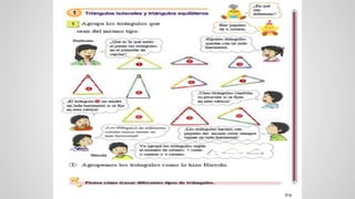 Este documento describe los tres tipos principales de triángulos: triángulo escaleno, que no tiene lados ni ángulos iguales; triángulo isósceles, que tiene dos lados iguales y dos ángulos iguales; y triángulo equilátero, que tiene tres lados iguales y tres ángulos iguales de 60 grados cada uno. También proporciona instrucciones para trazar triángulos y ejemplos de actividades.