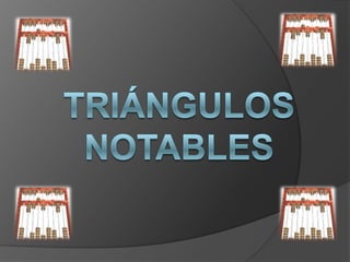 Este documento presenta información sobre triángulos notables. Explica que los triángulos notables son triángulos rectángulos cuyos lados tienen relaciones de números enteros o irracionales. Describe varios triángulos notables comunes como el triángulo de 45-45 y el triángulo de 30-60. Incluye ejemplos de cómo usar los triángulos notables para resolver problemas.