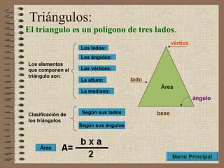 El documento describe las figuras geométricas del triángulo y el cuadrilátero. Explica los elementos que componen cada figura como los lados, vértices, ángulos, altura y diagonal. También clasifica los triángulos y cuadriláteros según sus características y describe cómo calcular el área de cada figura.