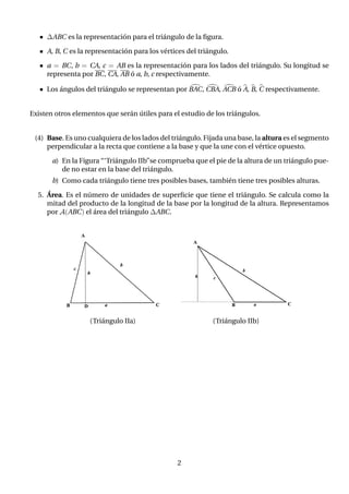 Este documento presenta una introducción a los triángulos. Define un triángulo como una figura plana delimitada por tres segmentos que se cortan dos a dos. Explica los elementos básicos de un triángulo como vértices, lados, ángulos, base y altura. También cubre temas como la igualdad de triángulos, ángulos determinados por rectas paralelas y propiedades de triángulos rectángulos como el teorema de Pitágoras y las leyes de las alturas y los catetos.