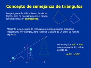 El documento describe la semejanza de triángulos y cómo se puede usar para calcular distancias inaccesibles mediante proporciones. Explica que dos triángulos son semejantes si sus ángulos correspondientes tienen la misma medida y sus lados correspondientes son proporcionales. Luego presenta varios ejemplos de cómo calcular alturas, distancias y otras medidas usando la propiedad de semejanza de triángulos.