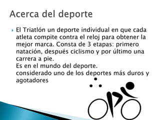 El triatlón es un deporte individual que consiste en natación, ciclismo y carrera a pie. Los récords mundiales masculino y femenino son de 1:48:24.02 y 1:58:27 respectivamente. En los Juegos Panamericanos la distancia es de 1,500m de natación, 40km de ciclismo y 10km de carrera. Adriana Barraza y David Núñez ganaron medalla de bronce para México en el Campeonato Panamericano Junior.