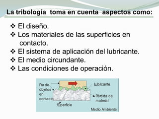 La tribología estudia la fricción, desgaste y lubricación entre superficies en contacto. Sus objetivos son reducir la fricción y desgaste para mejorar la eficiencia energética, velocidad y productividad de los sistemas mecánicos. La tribología considera factores como los materiales, diseño, lubricantes y condiciones de operación de las superficies en contacto.