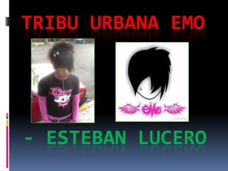El documento describe la tribu urbana emo, incluyendo su origen en la música emo de los años 80 y 90, su estética basada en problemas emocionales como usar ropa ajustada y oscura con accesorios fluorescentes, practicar cortes en la piel y fantasear con el suicidio, y escuchar bandas emo como Jimmy Eat World y Hawthorne Heights.