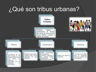 Este documento trata sobre las tribus urbanas juveniles. Explica que las tribus urbanas son grupos de jóvenes que comparten estilos de vestir, música e ideologías similares. Se originaron en los Estados Unidos en los años 1960 como forma de expresión y desacuerdo con las autoridades. Las tribus urbanas mantienen una estética distintiva y comparten creencias sociopolíticas o religiosas. La música y la vestimenta son importantes formas de expresión de cada tribu.