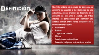 El documento describe varias tribus urbanas, incluyendo sus orígenes, características distintivas y estilos de vida. Se mencionan geeks, otakus, hipsters, reguetoneros, punks, skaters, raperos, emos, hippies, góticos, motociclistas, pelolais/fresas. Cada tribu urbana se distingue por su música, vestimenta, creencias e intereses compartidos.
